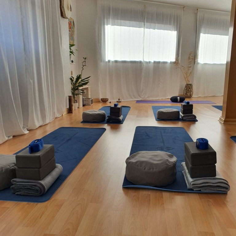 Equipamiento: torre de sonido, luz fría y cálida regulable, esterillas y materiales de yoga y de pilates (tacos, cinturones, mantas, cojines...), sillas, proyector...